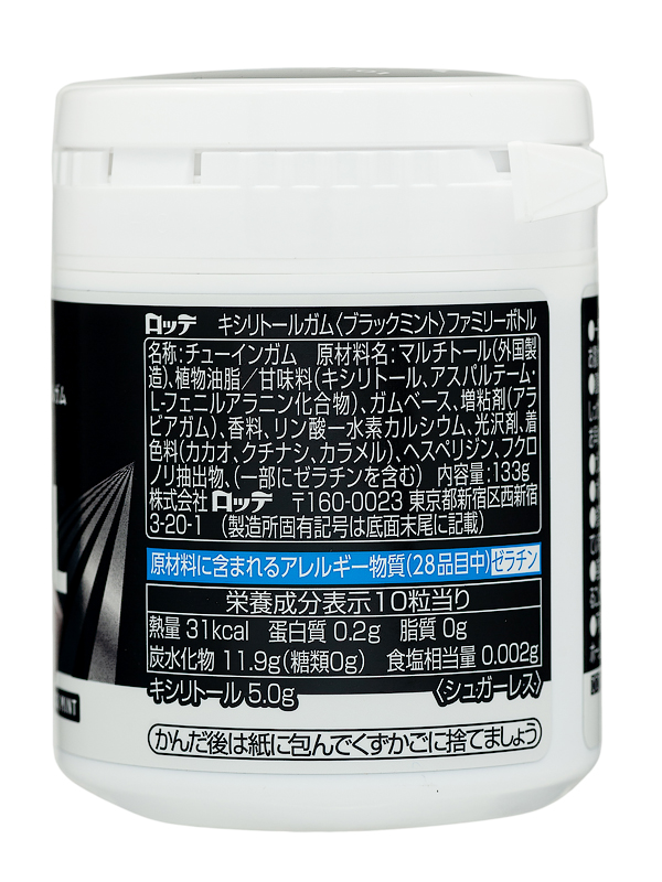 Мальтитол, растительное масло/подсластители (ксилит, соединение аспартама/L-фенилаланина), жевательная основа, загуститель (гуммиарабик), ароматизатор, моногидрофосфат кальция, осветлитель, красители (какао, гардения, карамель), гесперидин, экстракт фукуронори (частично содержит желатин).